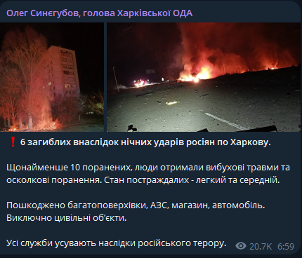 В Харькове шесть погибших и десять раненых в результате ночных ударов россиян.