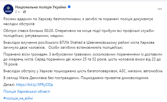 "В результате попадания российского БПЛА Shahed в Шевченковском районе города Харькова погибли двое мужчин. Личности погибших устанавливают полицейские. Ранены восемь граждан. С взрывными травмами, осколочными ранениями их доставили в больницы города. Среди раненых две женщины 25 и 52 лет, шесть мужчин от 23 до 76 лет" - говорится в сообщении.