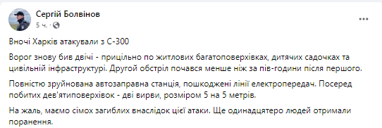 "Второй обстрел начался меньше чем через полчаса после первого. Полностью разрушена автозаправочная станция, повреждены линии электропередач. Посреди побитых девятиэтажек - две воронки, размером 5 на 5 метров. К сожалению, имеем семерых погибших в результате этой атаки. Еще одиннадцать человек получили ранения", - сказал он.