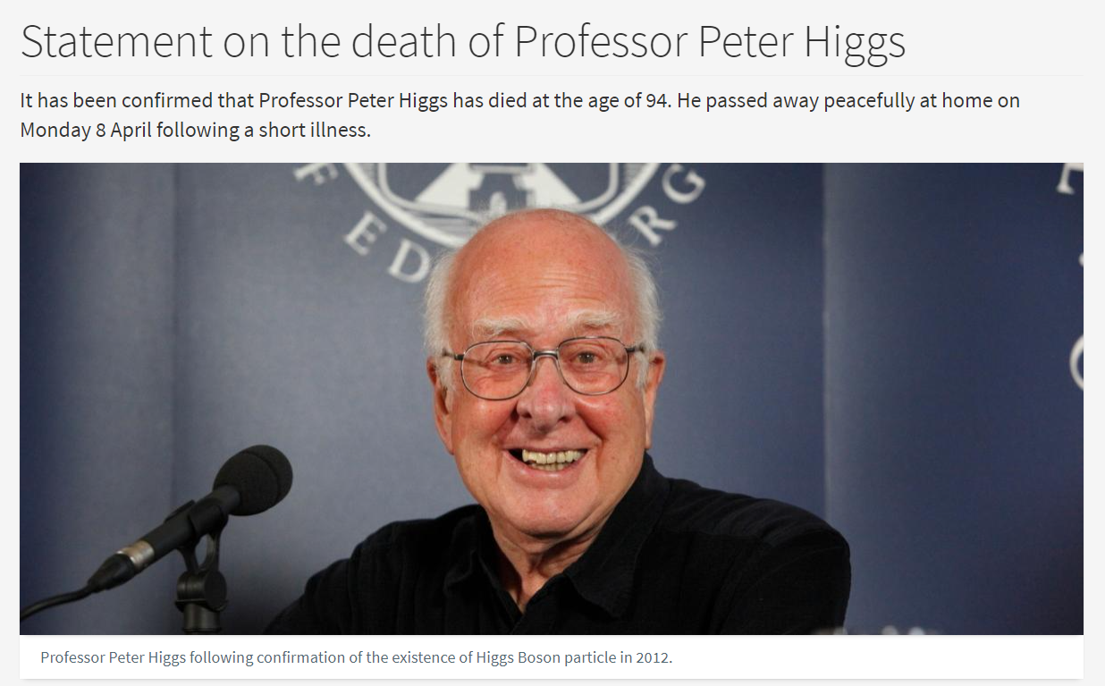 "Стало известно, что профессор Питер Хиггс скончался в возрасте 94 лет. Он мирно ушел из жизни у себя дома в понедельник, 8 апреля, после непродолжительной болезни", - говорится в сообщении, опубликованном на сайте университета.