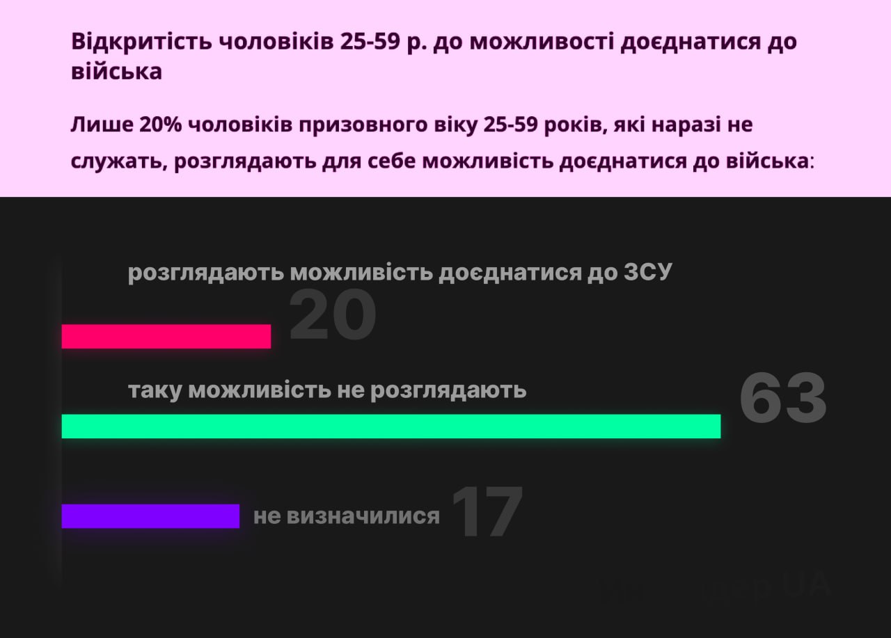 Сразу 63% украинских мужчин призывного возраста не хотят идти в армию. Обратного мнения придерживаются 20% мужчин 25-59 лет, которые пока не служат. Не определились 17%.