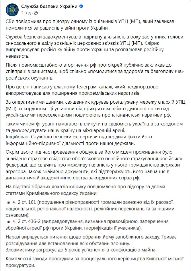После полномасштабного вторжения России протоиерей публично призвал к сотрудничеству с рашистами, чтобы совместно «помолиться за здоровье и благополучие» российских оккупантов. Об этом он написал в собственном телеграм-канале, который неоднократно использовал для распространения прокремлевских нарративов", - заявили в СБУ.
