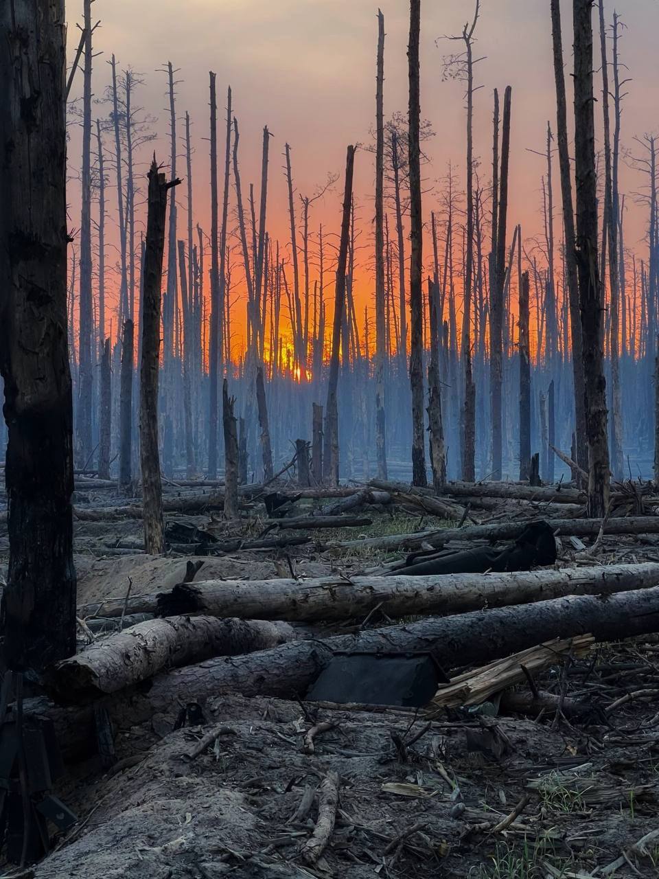 13:03 Рассвет в Серебрянскому лесу близ Кременной. Там уже почти два года пролегает линия фронта и идут ожесточенные бои. Лес фактически уничтожен.