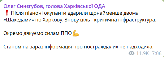 "После полуночи оккупанты ударили по меньшей мере двумя "Шахедами" по Харькову. Вновь цель – критическая инфраструктура", - написал он.