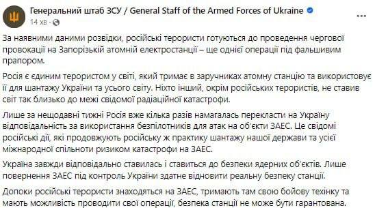 Генштаб ВСУ сообщает о возможной провокации на ЗАЭС. Фото: телеграм