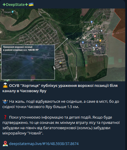 "Пока уточняем информацию и детали событий. Если будет подтверждено, то это означает как минимум потерю леса и частной застройки к северу от многоэтажной (когда-то) застройки микрорайона "Новый", - пишет Deep State.