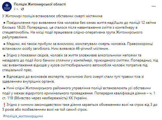 В Житомире коммунальщики случайно убили мужчину. Фото: полиция