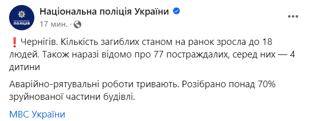 07:40 Число погибших в Чернигове после вчерашнего удара выросло до 18. Еще 77 человек пострадали, среди них четверо детей.