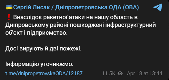 13:47 В Днепровском районе ракетами повреждены инфраструктурный объект и предприятие, сообщает ОВА.