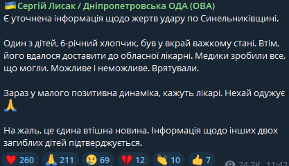 Ребенка из Синельниково Днепропетровской области, который считался погибшим, удалось спасти. 6-летний мальчик был в крайне тяжелом состоянии, но выжил. Сейчас у него положительная динамика.
