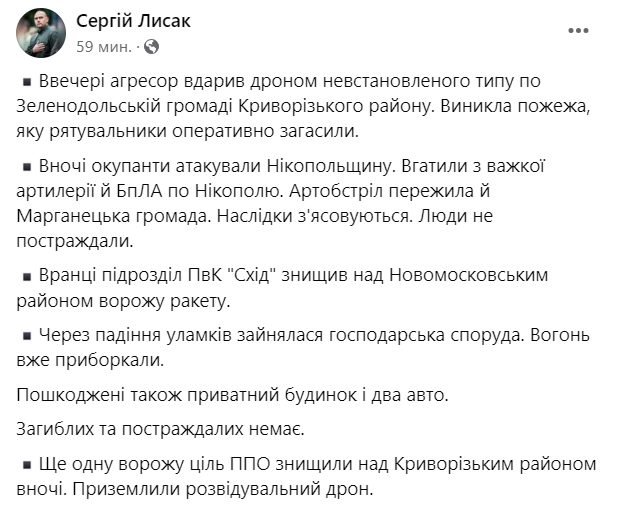 "Ночью оккупанты атаковали Никопольщину. Ударили из тяжелой артиллерии и БПЛА по Никополю. Артобстрел пережила и Марганецкая громада. Последствия выясняются. Люди не пострадали", - сообщил Лысак.