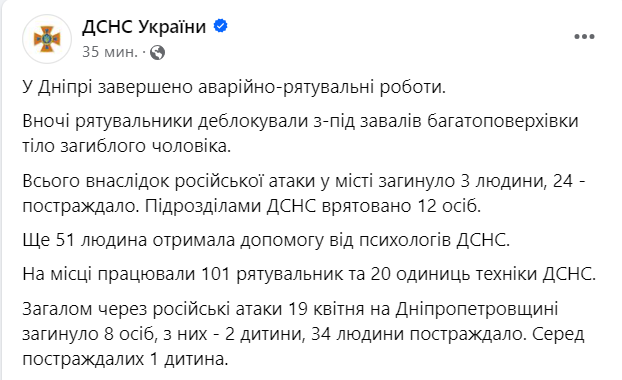 Всего из-за российских атак 19 апреля в Днепропетровской области погибли 8 человек, из них - 2 ребенка, 34 человека пострадали. Среди пострадавших один ребенок.