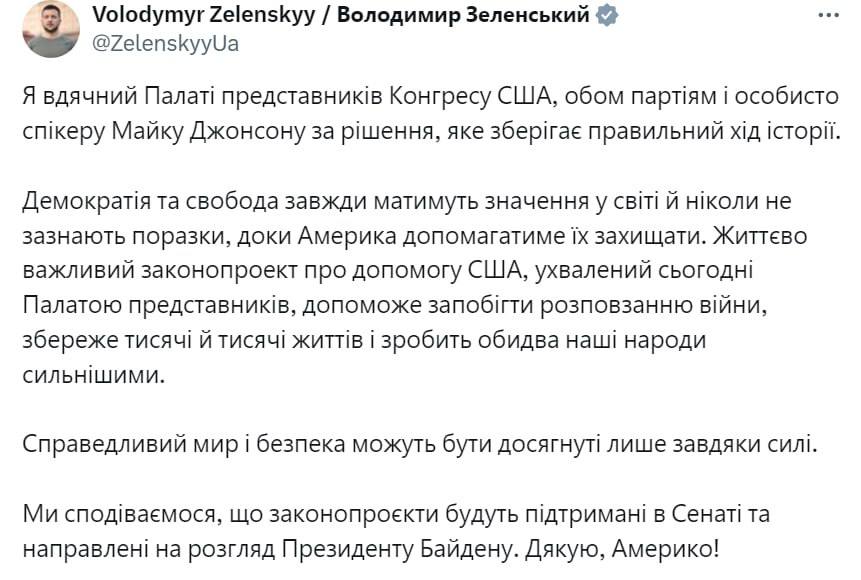 Президент Украины Владимир Зеленский поблагодарил Палату представителей Конгресса США и "лично спикера Майка Джонсона" за проголосованный законопроект о поддержке.
