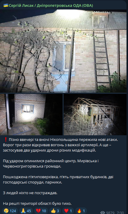 Вчера вечером и ночью российские военные атаковали Никопольщину. Под ударом оказались районный центр, Мировская и Красногригорьевская громады.