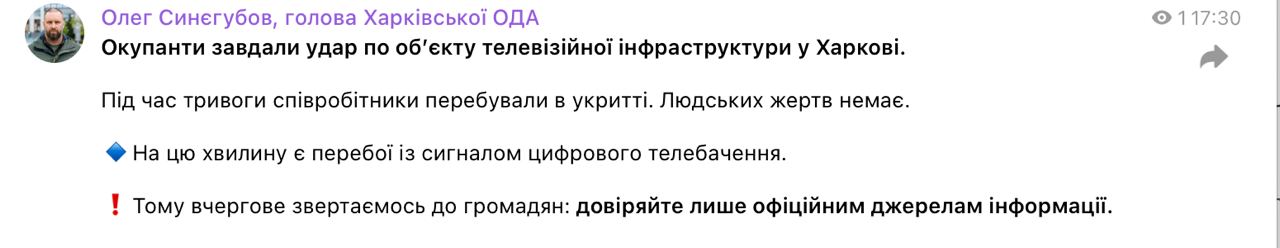 17.32 В Харькове был удар по объекту телевизионной инфраструктуры, сообщает ОВА.