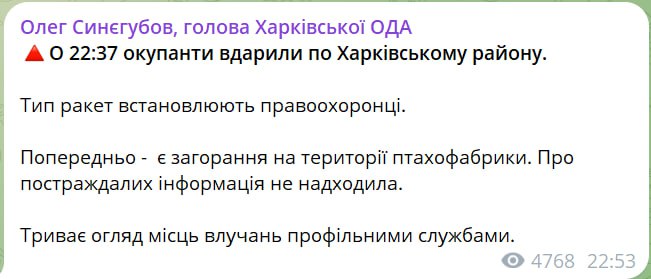 23.00 Глава Харьковской ОВА подтвердил вечерний ракетный удар по городу.