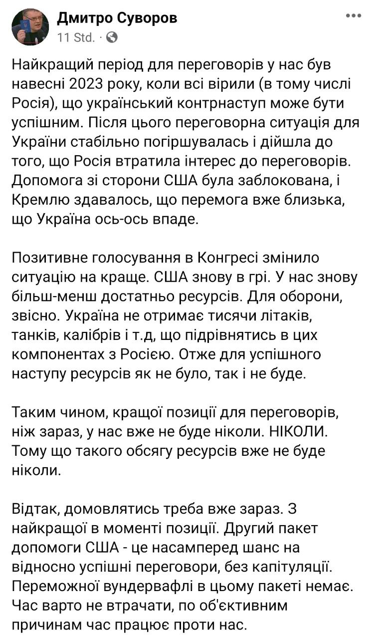 "Голосование в Конгрессе изменило ситуацию к лучшему. США снова в игре. У нас снова более-менее достаточно ресурсов. Для обороны, конечно. Украина не получит тысячи самолетов, танков и т.д., чтобы сравняться в этих компонентах с Россией. Так что для успешного наступления ресурсов как не было, так и не будет. Таким образом, лучшей позиции для переговоров, чем сейчас, у нас уже никогда не будет. Никогда. Потому что такого объема ресурсов уже никогда не будет. Следовательно, договариваться нужно уже сейчас. С наилучшей в моменте позиции", - написал он в Facebook.
