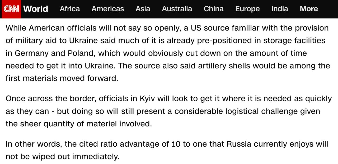 13.28 Большая часть американской помощи Украине, которую еще должен утвердить Сенат, была заранее размещена на складах в Германии и Польше, сообщает CNN со ссылкой на источник.