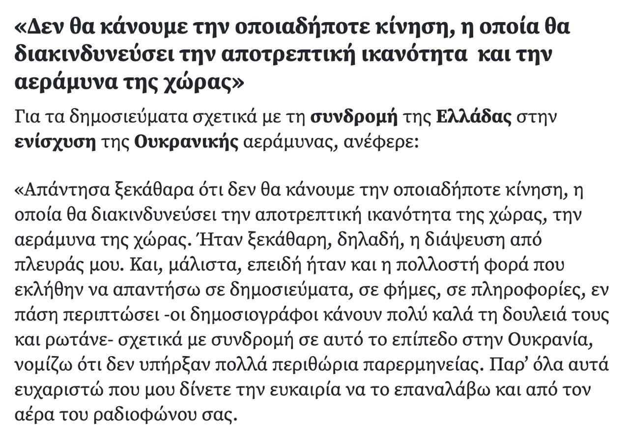 "Греция четко заявила, что не будет отправлять системы ПВО в Украину, чтобы не поставить под угрозу возможности собственной противовоздушной обороны", - заявил Маринакис в эфире радиостанции REAL FM.