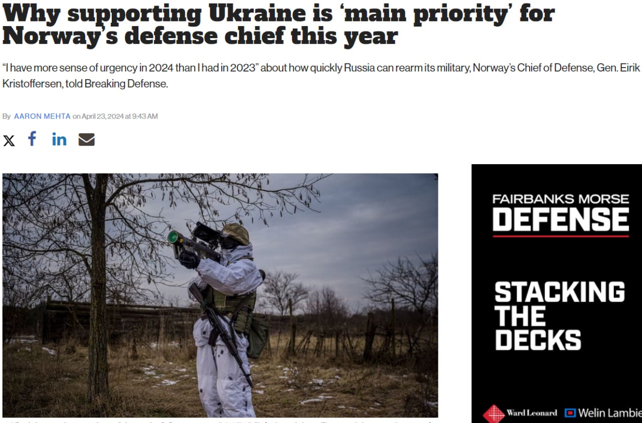 18.35 Главком норвежской армии Эйрик Кристофферсен заявил, что Вооруженные силы России улучшаются более быстрыми темпами, чем он ожидал.