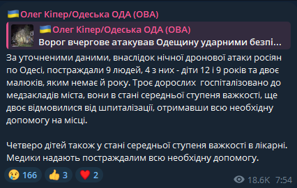 "По уточненным данным, в результате ночной атаки россиян по Одессе, пострадали 9 человек, 4 из них - дети 12 и 9 лет, а также двое, которым нет и года. Трое взрослых госпитализированы в медучреждения города, они в состоянии средней степени тяжести, еще двое отказались от госпитализации, получив всю необходимую помощь на месте", - сообщает Кипер.