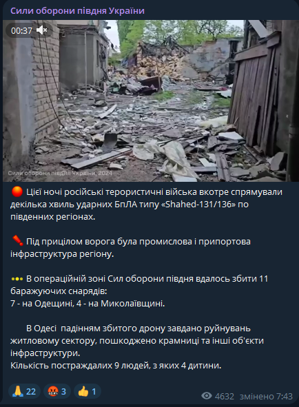 Ночью 23 апреля российские военные атаковали Одессу с помощью беспилотников "Шахед". В результате атаки девять людей пострадали, из них четверо - дети.