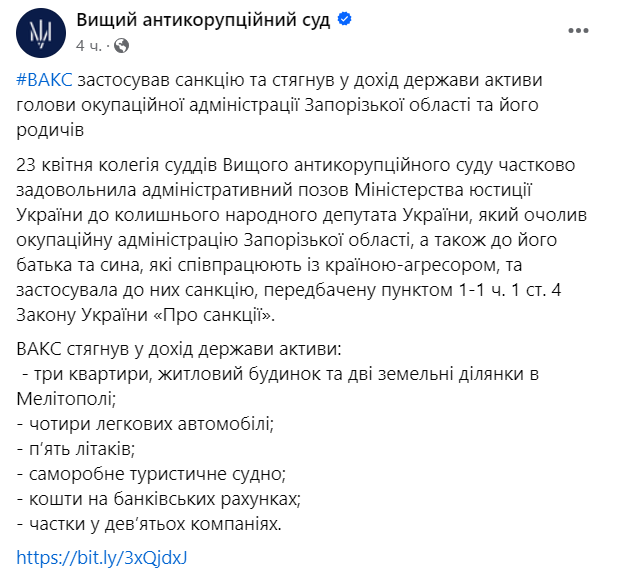 Под санкции попали: пять самолетов, три квартиры, жилой дом и два земельных участка в Мелитополе (который находится под контролем РФ), четыре легковых автомобиля, самодельное туристическое судно, средства на банковских счетах, доли в девяти компаниях.