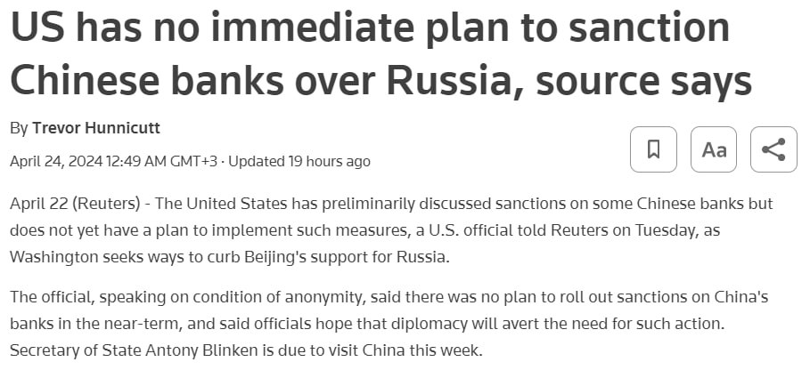 США пока не планируют вводить санкции в отношении китайских банков за сотрудничество с Россией, поскольку опасаются масштабных негативных последствий для мировой экономики и отношений с КНР.