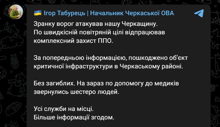 В Черкасской области повреждена критическая инфраструктура после утренней атаки РФ