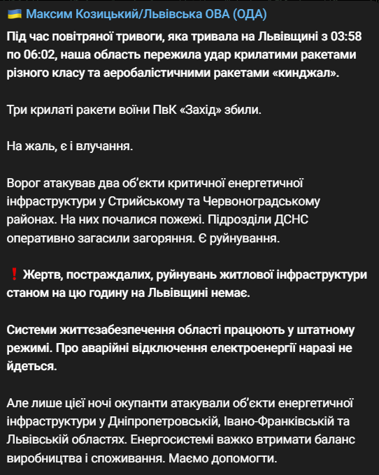 Напомним, что удары были также по Ивано-Франковской и Днепропетровской областям. Там тоже пострадали объекты энергетики.