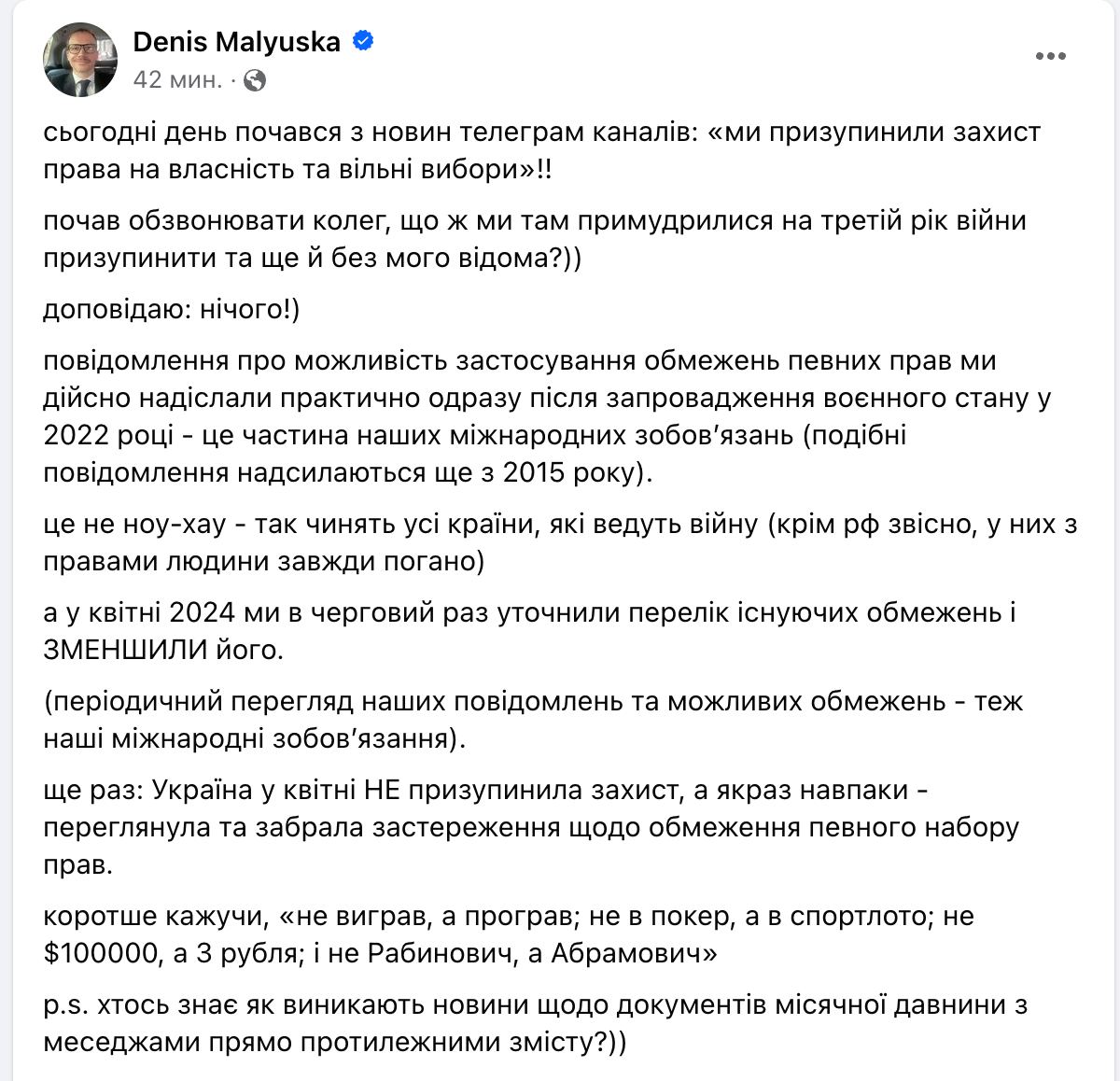 "Сообщение о возможности применения ограничений определенных прав мы действительно направили практически сразу после введения военного положения в 2022 году - это часть наших международных обязательств (подобные сообщения направляются еще с 2015 года). Это не ноу-хау - так поступают все страны, которые ведут войну. А в апреле 2024-го мы в очередной раз уточнили перечень существующих ограничений и уменьшили его", - написал Малюська в Фейсбуке.