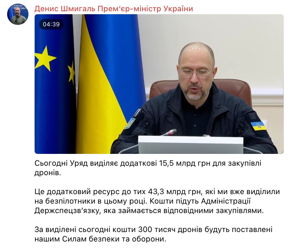 17:48 Кабмин выделил дополнительные 15,5 млрд грн на закупку 300 тысяч дронов для ВСУ, сообщил премьер Денис Шмыгаль.