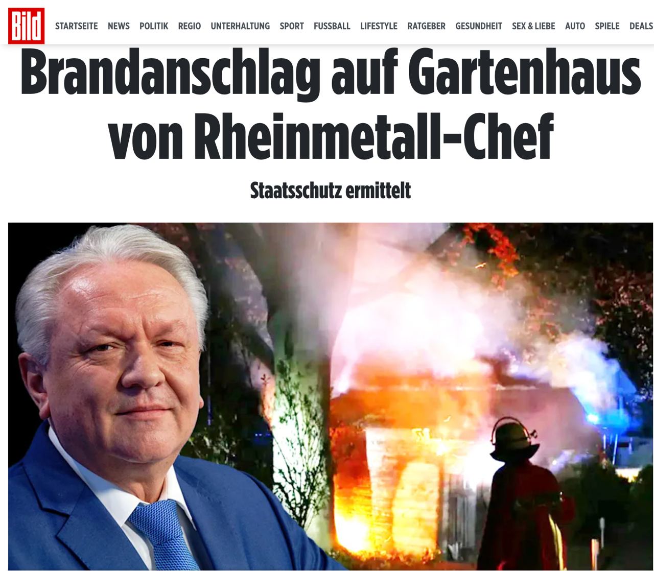 В Германии леворадикалы подожгли садовый домик главы оружейной компании Rheinmetall Армина Паппергера из-за поставок оружия в Украину.
