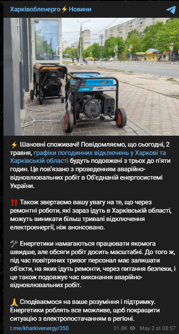 "Сегодня, 2 мая, графики почасовых отключений в Харькове и Харьковской области будут удлинены с трех до пяти часов", - говорится в сообщении.
