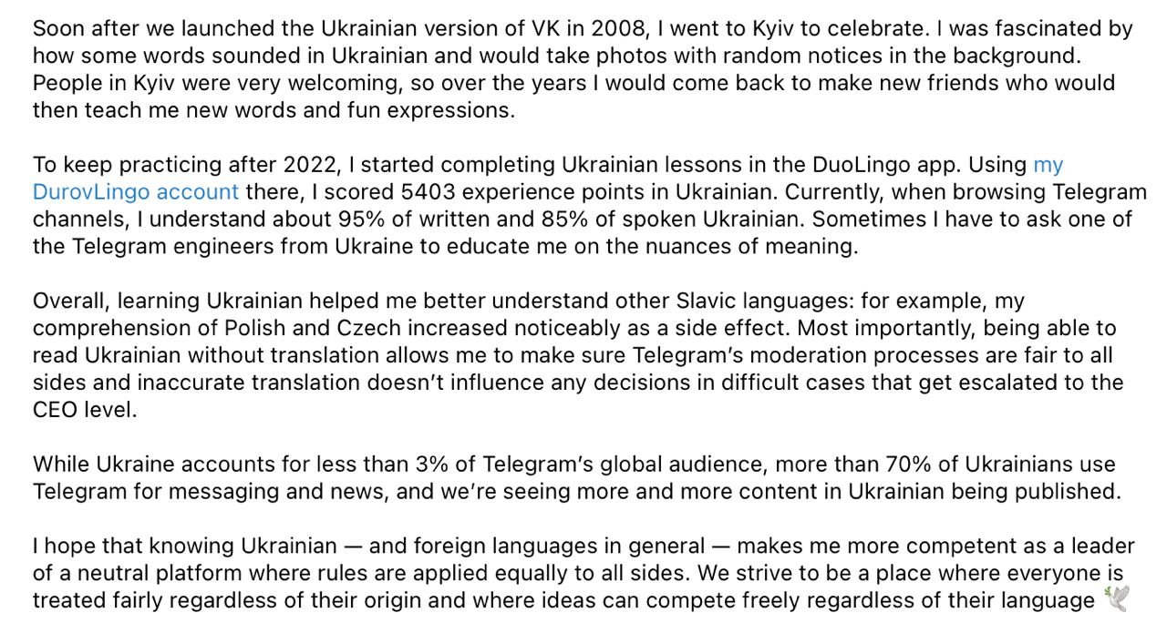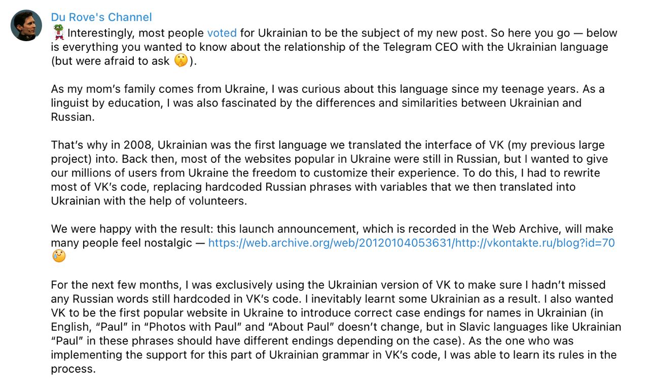 Основатель Телеграма Павел Дуров рассказал, что семья его матери родом из Украины, а сам он свободно понимает украинский язык.