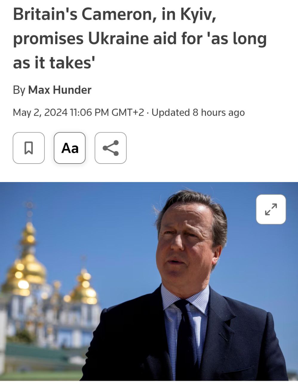 "Украина имеет на это право. Точно так же, как Россия наносит удары внутри Украины, вы можете вполне понять, почему Украина чувствует необходимость убедиться, что она защищает себя", — сказал Кэмерон во время визита в Киев 2 мая.