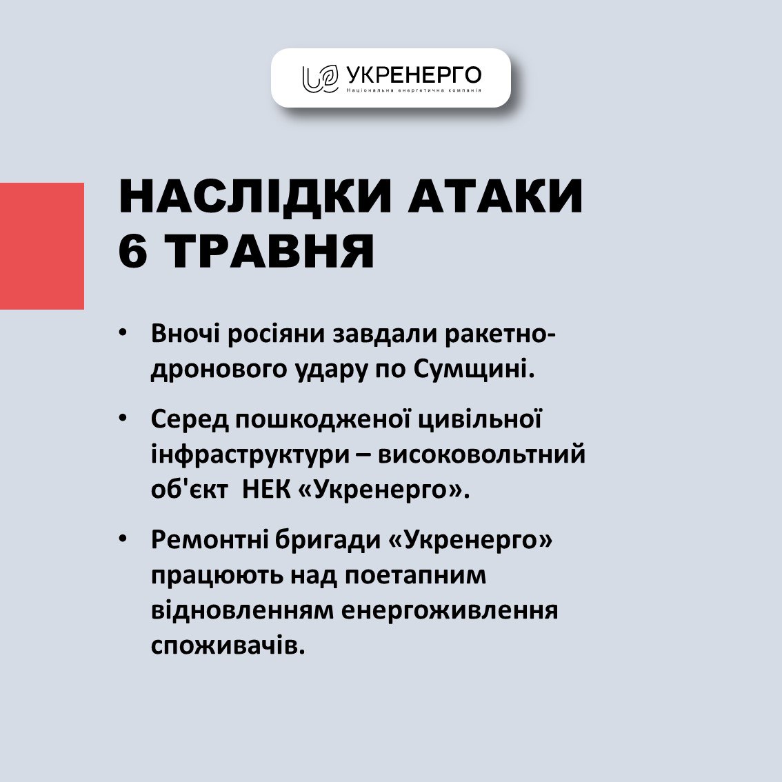 09.00 В Сумской области с ночи идут отключения света после прилета по объекту "Укрэнерго", сообщили в компании.