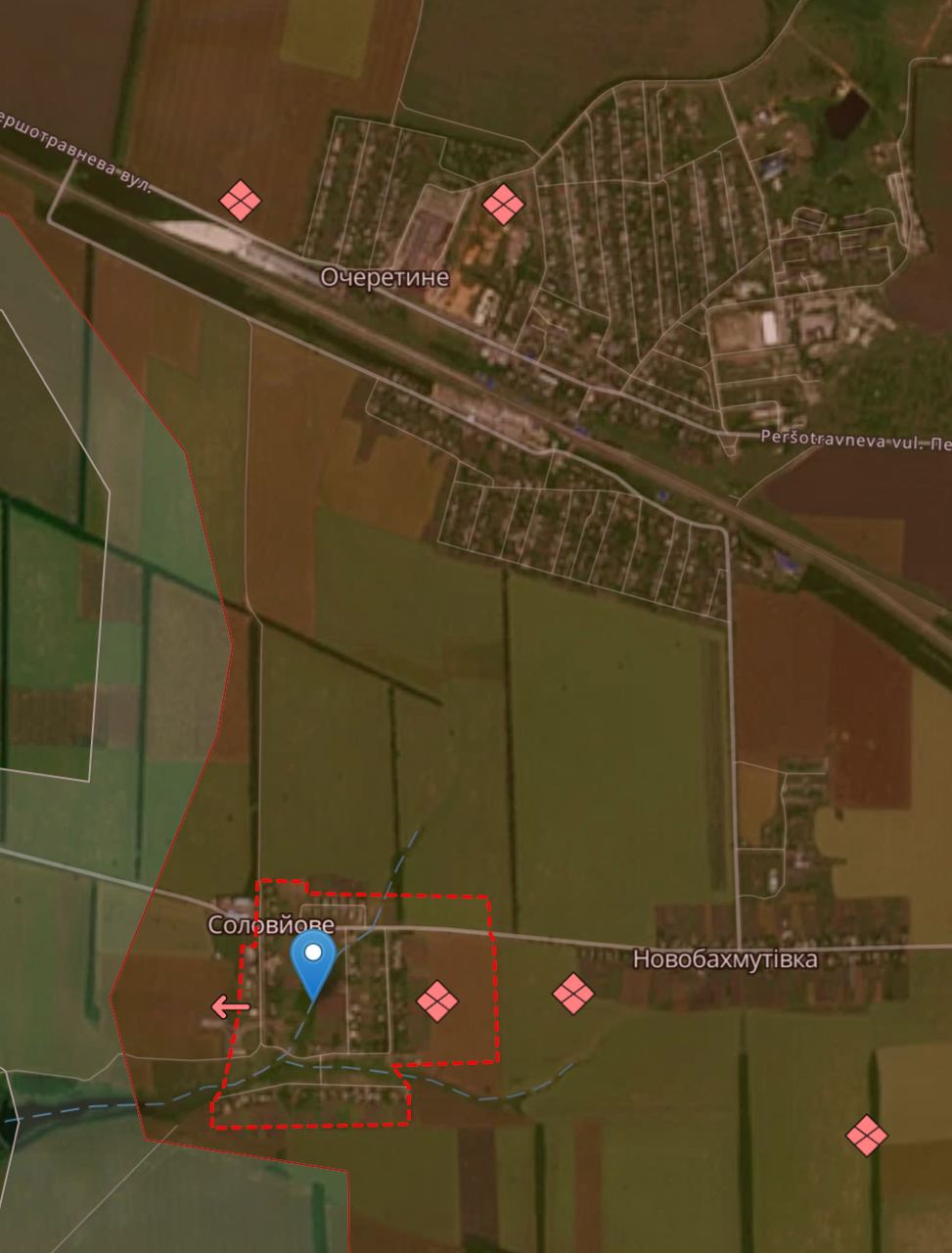 Соловьево находится на авдеевском направлении, южнее Очеретино. На карте Deep State оно также указано, как захваченное РФ.