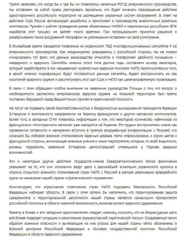 "Создаваемые таким образом военные опасности и вытекающие из них угрозы для нашей страны чётко обозначены в Военной доктрине РФ и Основах государственной политики Российской Федерации в области ядерного сдерживания (в документах описываются ситуации, при которых Россия может применить ядерное оружие - Ред.)... Рассчитываем, что данное мероприятие (ядерные учения - Ред.) остудит горячие головы в западных столицах, поможет осознать возможные катастрофические последствия генерируемых ими стратегических рисков, удержит их от втягивания в прямую вооружённую конфронтацию с Россией", - говорится в заявлении МИД.
