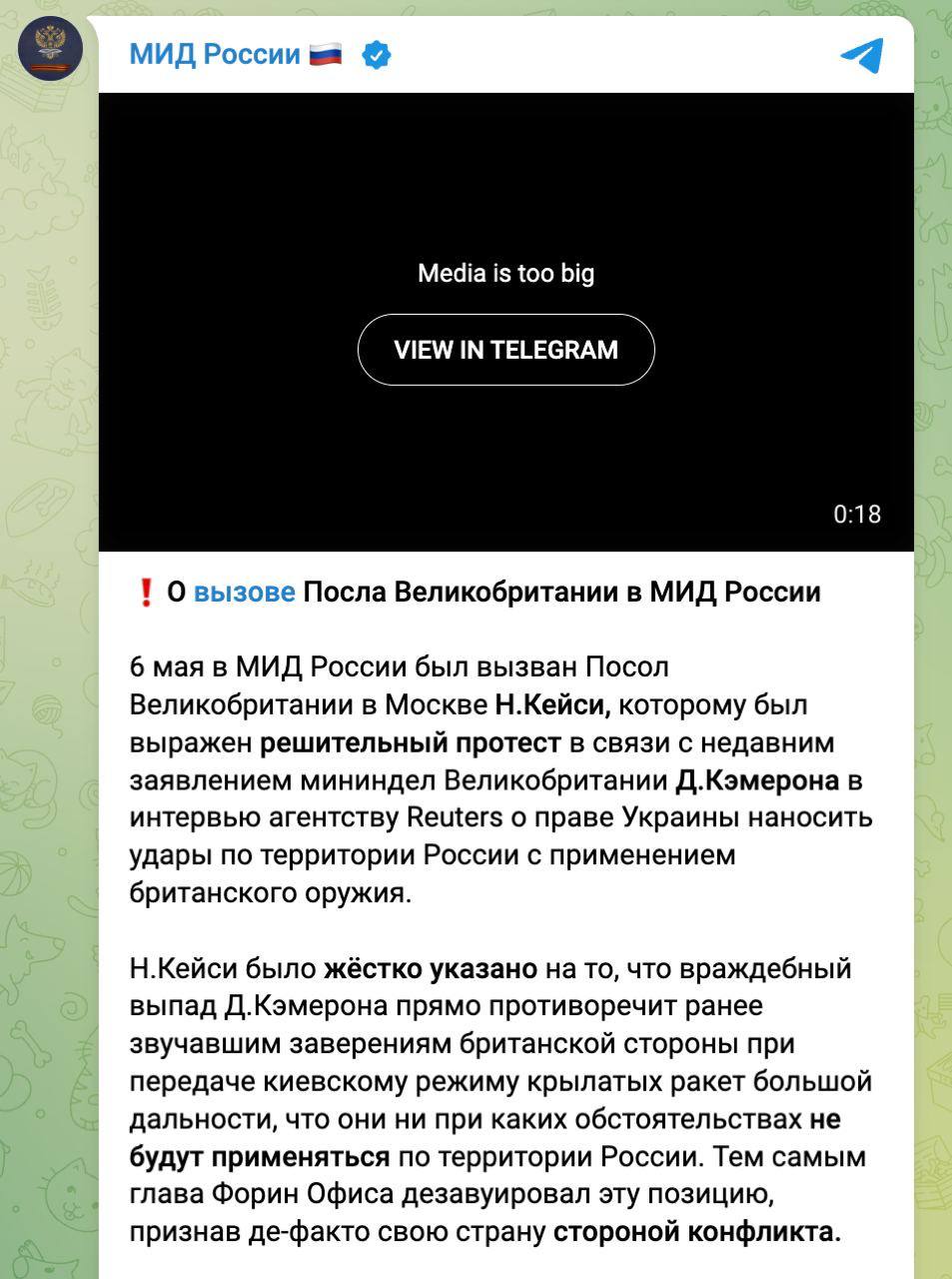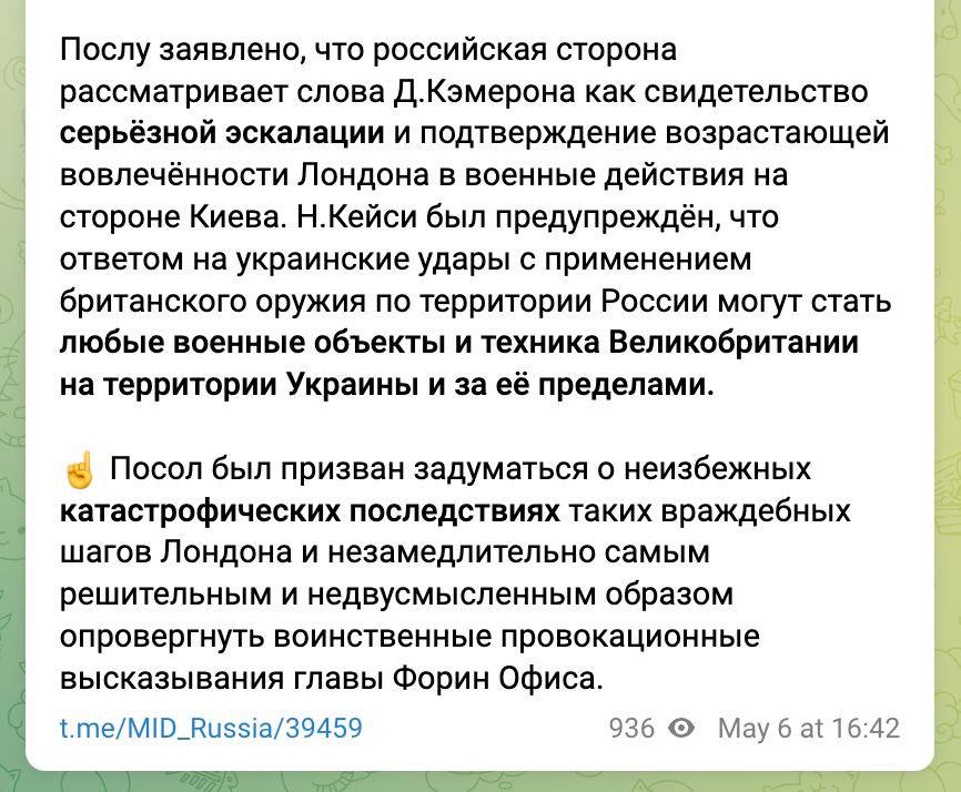 Напомним, глава МИД Кэмерон заявил, что Украина может наносить удары по территории РФ переданным Британией оружием.