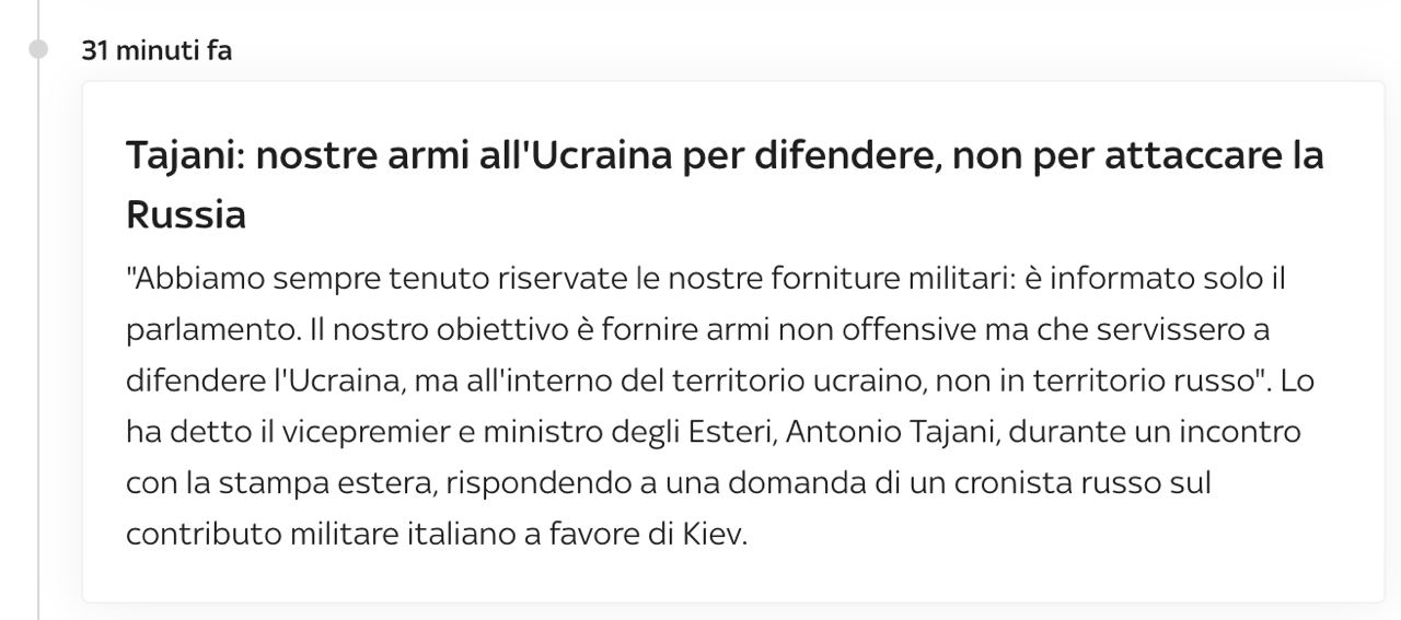 "Мы всегда сохраняли конфиденциальность наших военных поставок: информируется только парламент. Наша цель - поставлять ненаступательное оружие, которое служит для защиты Украины, но на территории Украины, а не на территории России", - приводит его слова SkyTG24.