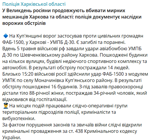 "Военные РФ нанесли удар ФАБ-1500 с модулем УМПК по селу Моначиновка Купянского района. В результате обстрела повреждены 16 домов. Из-под завалов правоохранители извлекли тело 88-летней женщины, пострадал 34-летний мужчина, отказавшийся от госпитализации", - говорится в сообщении.