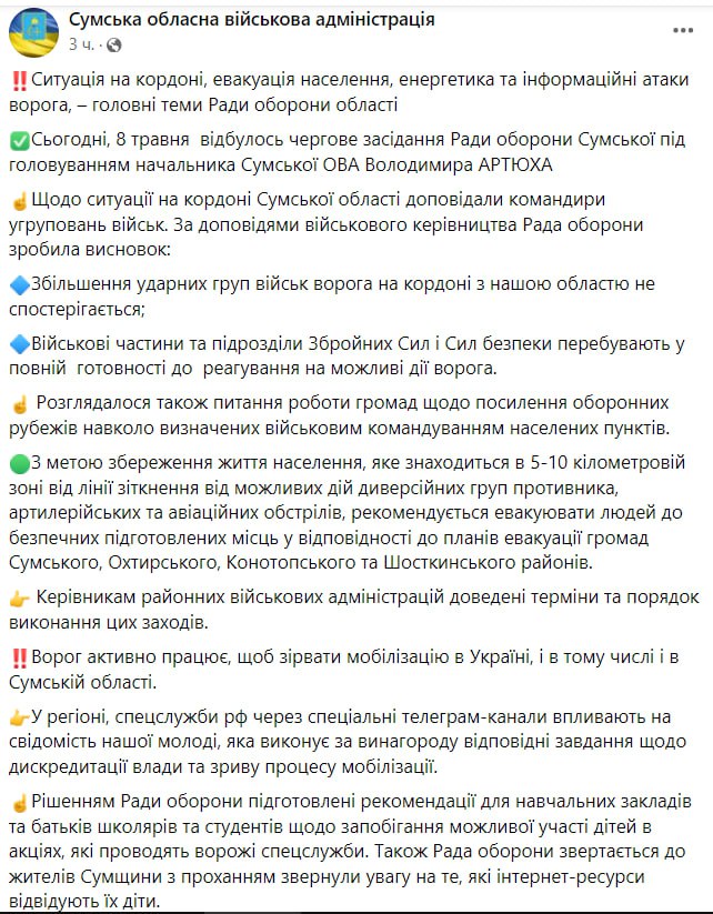 Также Совет обороны обратился к жителям Сумской области с просьбой обратить внимание на то, какие интернет-ресурсы посещают их дети.