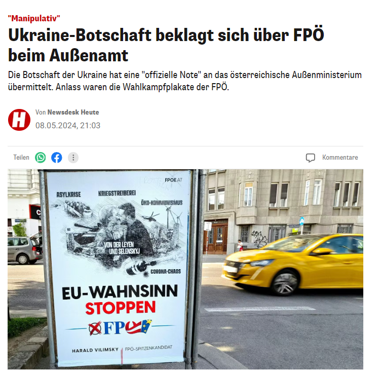 Украинское посольство передало в австрийский МИД официальную ноту, заявив, что "реклама партии искажает причины и характер войны, оскорбляет украинский народ и оправдывает российскую агрессию".
