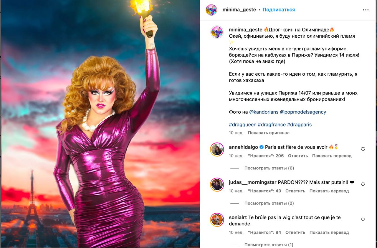 "Я подтверждаю свою полную поддержку ей. Я повторю: я горжусь, и да, Париж гордится тем, что drag queen будет нести факел и ценности мира", - заявила мэр Парижа Анн Идальго.