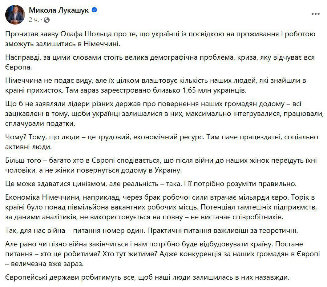 Такое мнение высказал глава Днепропетровского областного совета Николай Лукашук на своей странице в Фейсбуке, комментируя заявление канцлера Германии Олафа Шольца о том, что украинцы смогут остаться в ФРГ навсегда, особенно если устроятся на работу.