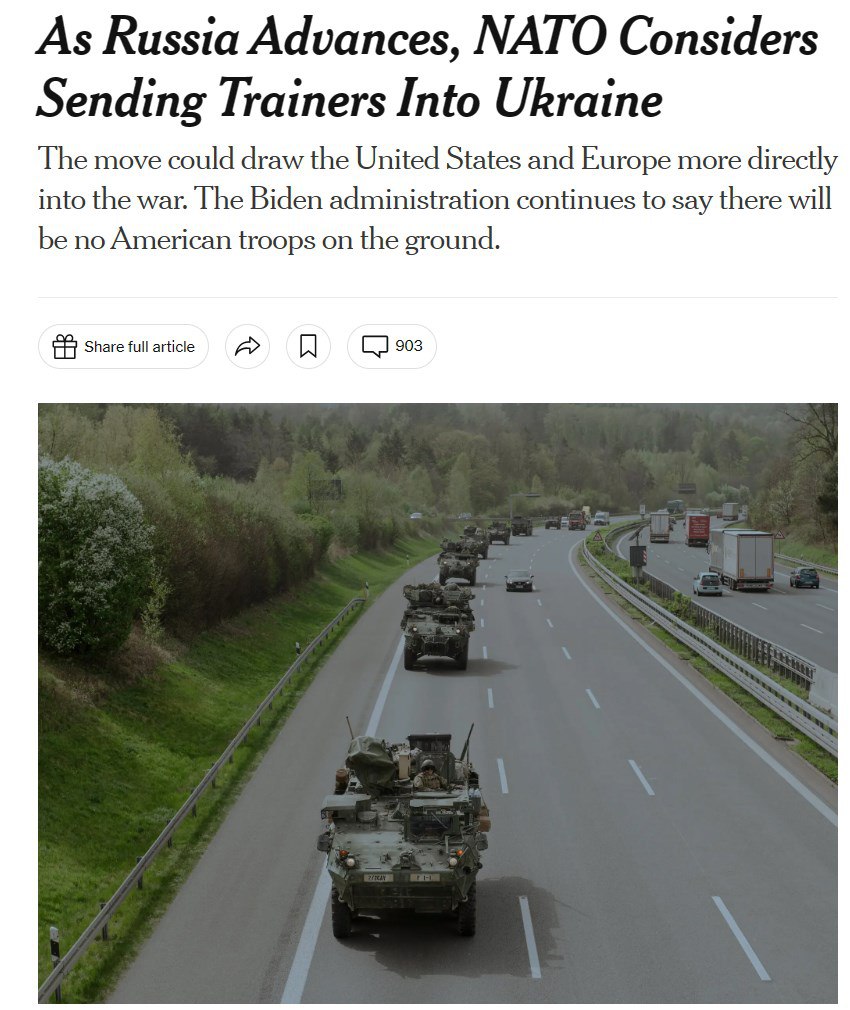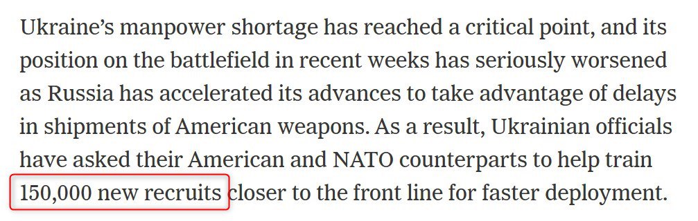 Также в статье New York Times упомянуто количество солдат, которых планируют обучить ВСУ для отражения российского наступления этим летом - 150 тысяч человек.