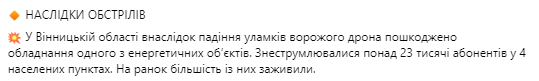 "В Винницкой области в результате падения обломков вражеского дрона повреждено оборудование одного из энергетических объектов. Обесточены более 23 тысяч абонентов в 4 населенных пунктах. К утру большинство из них запитали" - говорится в сообщении.