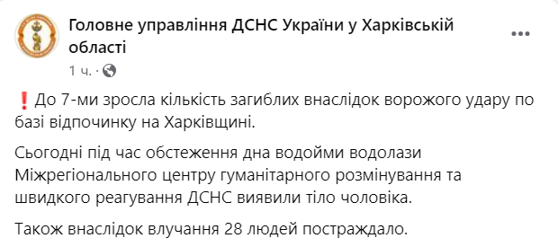 Число погибших в результате удара российских оккупантов по базе отдыха в Черкасской Лозовой Харьковской области увеличилось до семи человек. Пострадали - 28 человек.