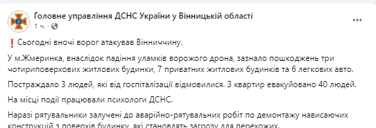 Сегодня ночью российские войска атаковали ударными дронами Винницкую область. В результате падения обломков "Шахеда" в Жмеринке повреждены жилые дома и автомобили. Пострадали три человека.